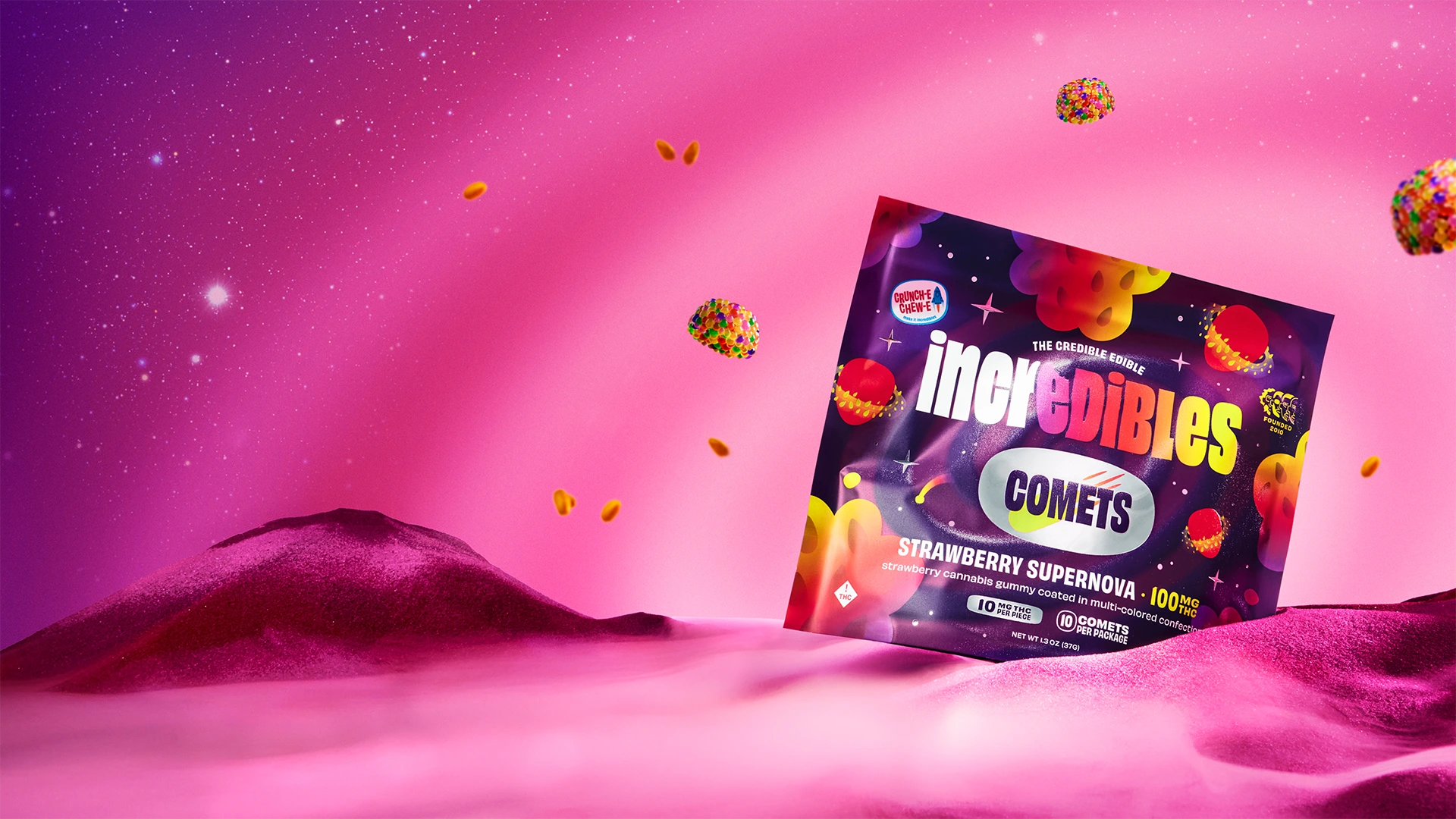 Out-of-this-world strawberry gummy flavor dosed to perfection with crunchy rainbow space rocks. Crunchy. Chewy. Cosmic.